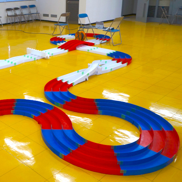 協栄工業ミニ四駆大会の休憩中にぴちょんくん号でコースを試走。ぴちょんくんのペースでゆっくりお散歩。坂道が登れないハプニングもありましたが、何とか無事ゴールできました。